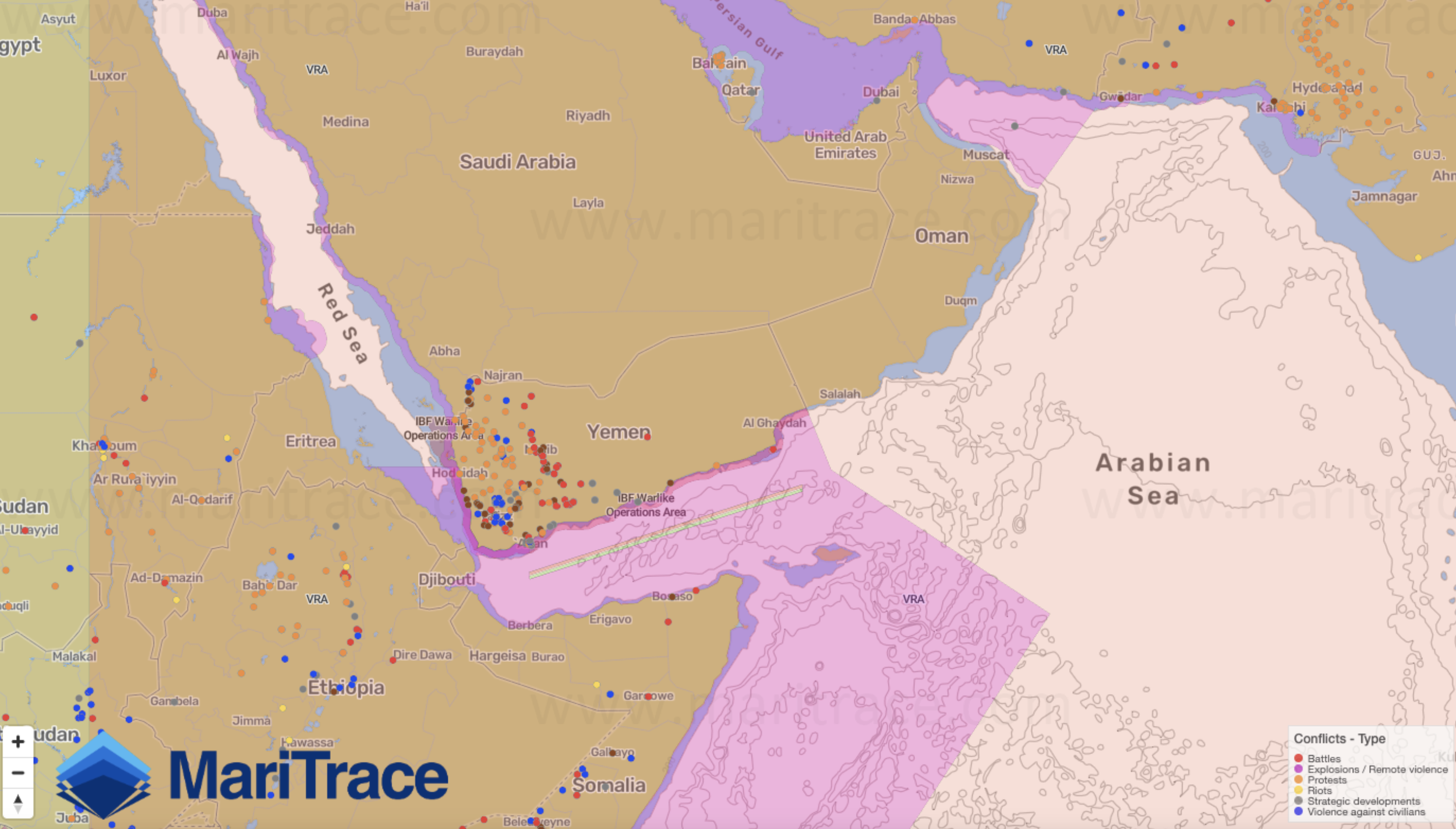 Risks to commercial shipping are indirectly affected by conflict and violence on land – whether it’s port closure due to civil unrest, commercial vessels caught in the cross-fire of a drone strike or low-level, persistent background threat from acts of piracy that arise through inter-state rivalries. The insurance market is affected, too. To help our clients navigate these risks, we include data on global political violence and conflict events (sourced from Armed Conflict Location & Event Data (ACLED)), available to subscribed users directly via the MariTrace platform.